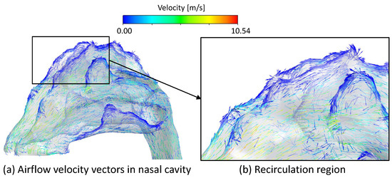 Velocity vectors in the nasal cavity in front of the olfactory region: (a) Airflow velocity vectors in nasal cavity, and (b) Recirculation region.