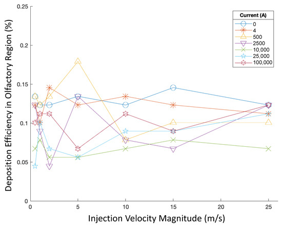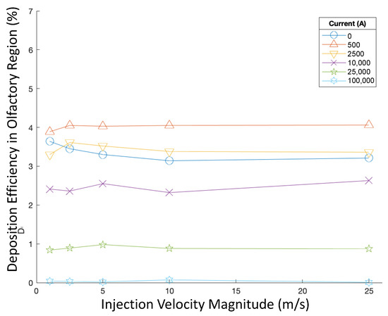 The deposition efficiency (DE) in the olfactory region with different parameter values is visualized and compared in this section in order to find the optimized injection strategy to achieve the highest DE. Specifically, olfactory deposition was first recorded for varied injection velocities and currents. Particles were injected uniformly across the nasal inlets perpendicular to the inlet boundaries. Particles had a constant aerodynamic diameter of 50 nm. Deposition efficiencies are displayed in Figure 5.