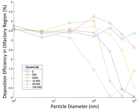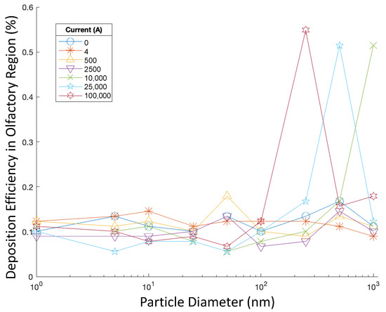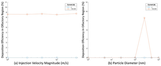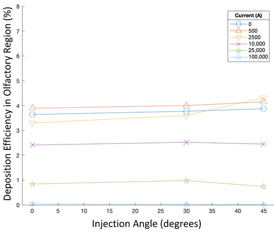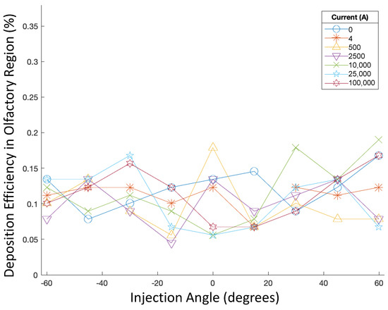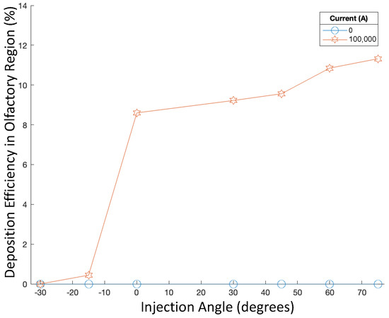In addition, the injection angle was then varied from to along with the current, while the particle aerodynamic diameter was kept constant at 50 nm, and the injection velocity was kept constant at 5 m/s. Accordingly, the deposition efficiencies are displayed in Figure 6.