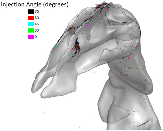 Targeted injections consisted of 5000 particles injected from specific positions 1 mm deep into the inlets, totaling 10,000 particles. A cone injection was used for targeted release, with a constant spray cone half angle of (see Figure 2b). The injection angle was measured from the normal vector to the nasal inlets (i.e., the vertical axis) to the axis of the cone. An initial targeted injection position was tested, and this position was also adjusted by moving it back along the nasal inlets.