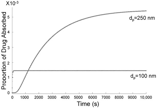 A larger particle size corresponds to a lower diffusion coefficient, meaning slower diffusion through the mucus layer covering the olfactory epithelium. On the other hand, larger particles experience less drag force, meaning weaker magnetic forces can more easily draw more particles toward the olfactory region. In some cases, there exists a trade-off between deposition efficiency and the time needed for the drug to diffuse through the mucus layer before it is actually absorbed through the olfactory epithelium. In other words, it may be easier to achieve higher deposition efficiency using magnetic fields on larger nanoparticles, but these particles would take longer to be absorbed compared to smaller nanoparticles. Depending on the intention of medical treatment, whether a small amount of a drug must be absorbed quickly, or a larger amount must be absorbed gradually, specific particle diameters would be more suitable.