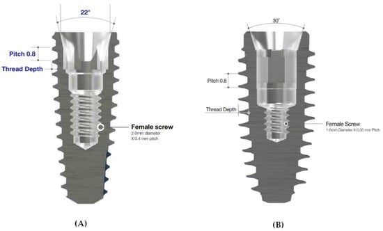 Designs and dimensions of the fixture, abutment, and abutment screw. (A) AnyOne® fixture with 4.5 mm diameter; (B) BlueDiamond® fixture with 4.4 mm diameter.
