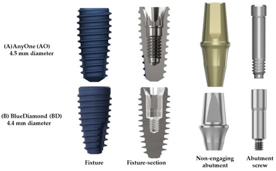 The fixture design in the AO group had a diameter of 4.5 mm, length of 8 mm, and screw thread pitch of 0.8 mm. A profile of 5.5 mm, cuff height of 3.5 mm, and post height of 5.5 mm was used for the abutment in the second premolar. Furthermore, a profile of 6.5 mm, cuff height of 3.5 mm, and post height of 5.5 mm was used for the abutment utilized in the second molar. The abutment screw had a head diameter of 2.3 mm, a body diameter of 1.96 mm, a length of 10.1 mm, and a screw thread pitch of 0.4 mm. The fixture design in the BD group had a diameter of 4.4 mm, length of 8 mm, and screw thread pitch of 0.8 mm. In addition, for the abutment used in the second premolar, the profile was 5 mm, the cuff height was 3 mm, and the post height was 5.5 mm. For the abutment used in the second molar, the profile was 6 mm, the cuff height was 3 mm, and the post height was 5.5 mm. The abutment screw had a head diameter of 2.6 mm, a body diameter of 2.38 mm, a length of 9.9 mm, and a screw thread pitch of 0.35 mm (Figure 1 and Figure 2).