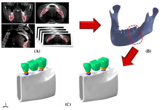 Mandible reconstruction and implant-supported fixed three-unit fixed dental prostheses. (A) Geometry data extraction from cone-beam computed tomography images; (B) reconstruction of surface and volume for mandible bone; (C) finite element analysis surgical model.