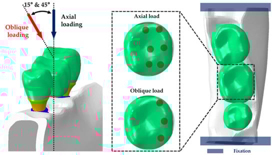 - Barbier, L.; Sloten, J.V.; Krzesinski, G.; Van Der Perre, E.S. Finite element analysis of non-axial versus axial loading of oral implants in the mandible of the dog. J. Oral Rehabil. 1998, 25, 847–858. [Google Scholar] [CrossRef] [PubMed]