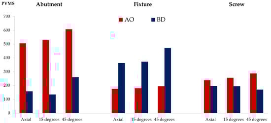 The PVMS values of the fixture, abutment, and abutment screw were compared (Figure 6 and Table S1). The PVMS value of the fixture in the BD group was more than twice that in the AO group. In contrast, the PVMS values of the abutment and abutment screws were lower in the BD group than in the AO group. The AO group displayed a three-fold-higher PVMS value for the abutment than the BD group. Furthermore, for the abutment screw, the highest stress was generated in the fourth to fifth thread positions in the AO group, and the BD group also had the highest stress in the fourth thread region (Figure 7).