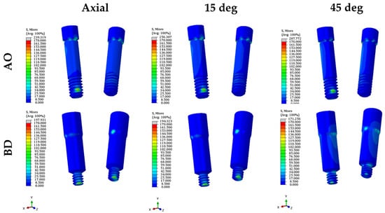 Consequently, ISFDP misconnection is frequently observed in clinical cases []. These microgaps due to misconnection at the implant–abutment interfaces may cause microorganisms around the fixture and generate micromovements at the threads of the bolted joint []. In the EZ post non-engaging abutment of BD implants, the connecting part (index part) of the abutment was removed to achieve a passive fit. However, when an eccentric force is applied, a greater stress concentration can occur around the abutment screw []. Therefore, the thickness of the abutment screw was increased to compensate for the abutment screw stress concentration caused by changes in the abutment structure (BD in Figure 7). In a general dental implant system, the same abutment screw is used for engaging and non-engaging abutments. However, in the BD implant non-engaging abutment, the shank of the abutment screw is thicker (abutment screw in Figure 2B), unlike the screw used in the engaging abutment. This thick screw is a cause of lower stress than the AO abutment screw under various loading conditions. According to Hansson, a larger screw diameter correlates with stronger load bending [].
