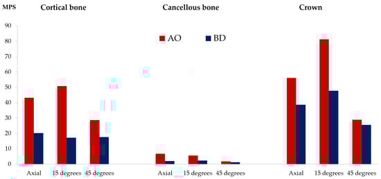 For the cortical bone, cancellous bone, and crown, the stress value was derived as MPS rather than PVMS. The AO group presented higher stress values than the BD group in the cortical bone, cancellous bone, and crown (Figure 8 and Table S1).