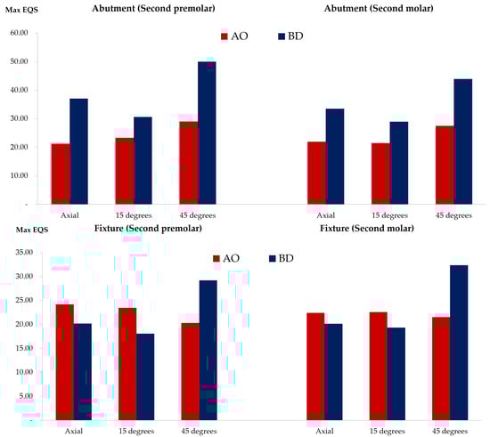 Stress was derived from the surface in contact with the abutment and fixture since they were combined and measured in two areas of the second premolar and second molar, respectively. The average stress on the outer surface of the abutment was lower in the AO group than in the BD group under all load conditions (Figure 9 and Table S2) (Figure 10) (Figure 11). These findings confirmed that the BD group presented a better stress distribution than the AO group under the axial and 15° load in the stress distribution for the inner surface of the fixture. However, the average stress of the BD group at the 45° load was 1.5 times higher than the AO group.