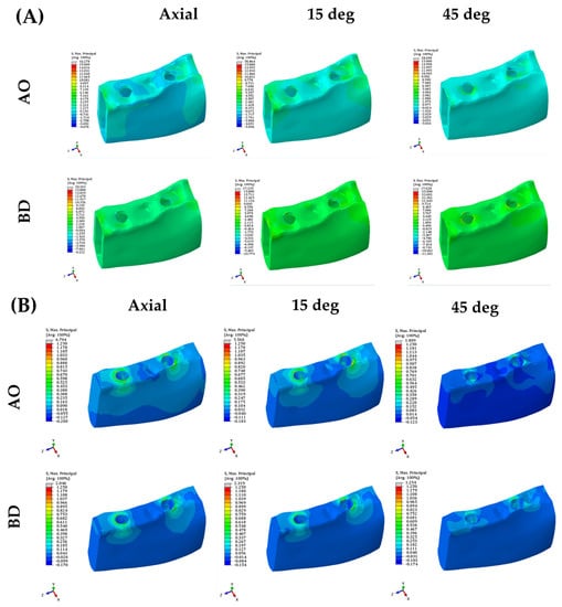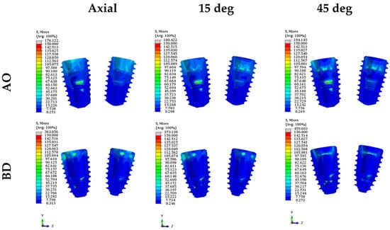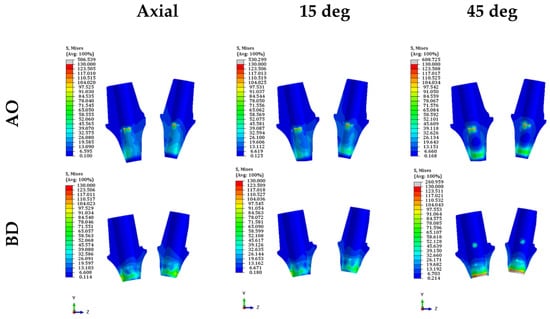 The stress transmission from the implant system to the bone in the axial loading was better than that in the lateral loading (15° and 45°). Excess stress concentration in the peri-implant bone and deformation beyond the bone’s physiological limit cause microcracks and bone resorption []. Compared with the AO group, the BD group displayed less stress concentration in the bone. Therefore, the BD implant system had less effect on the bone, possibly resulting in a higher implant success rate [].