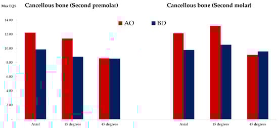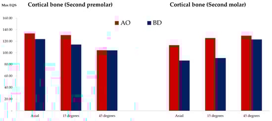The stress values of the entire surface where the cortical and cancellous bone were in contact with the fixture were measured (Figure 12 and Table S2) (Figure 13). The stress distribution in the cancellous bone was higher in the AO group than in the BD group in the second premolars and molars. The AO group presented approximately 1.3-fold higher stress distribution than the BD group under the vertical and 15° loads. The difference at the 45° load was smaller than that at the vertical and 15° loads. The stress distribution in the cortical bone in the second premolars and molars was higher in the AO group than in the BD group. The AO group was approximately 1.3-fold higher in vertical load and 15° load. The two groups had no significant difference at the 45° load.