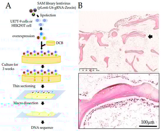 17]. First, lentiMPHv2 was transduced into HEK 293T and UE7T-9 cells, and transduced cells were selected using hygromycin B for 2 weeks. Then, lenti-dCAS9-VP64 was induced in MPH-expressing HEK 293T cells and UE7T-9 cells, and selected by Blasticidin (10 μg/mL, Thermo Fisher Scientific, Walthum, MA, USA) for 2 weeks. MPH-dCas9-VP64-expressing HEK 293T and UE7T-9 cells were applied to further experiments. The CRISPR-activated library, lenti-SAMv2, was also transduced into MPH-dCas9-VP64-expressing UE7T-9 cells. Although the multiplicity of infection (MOI) is usually set to 1 or less, in this study, we allowed duplicate infections (MOI > 1) because our goal was to invade DCB. We then performed selections with zeocin (300 μg/mL, Thermo Fisher Scientific, Walthum, MA, USA) for 2 weeks.