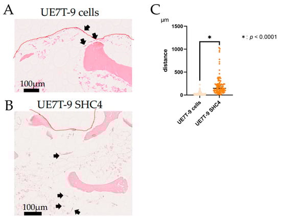 We used a scratch assay to evaluate cell migration ability. UE7T-9 cells were cultured at 3.0 × 10⁴ cells/70 µL using culture inserts (Ibidi, Gräfelfing, Germany). After 24 h, we removed the culture inserts, and HEK293T cells were cultured for 18 h. Formalin fixation and HE staining were then performed. The area between inserts after cell migration (cell-free area) was measured using Image J 1.53k (Wayne Rasband and contributors, National Institutes of Health, MD, USA). Data were statistically analyzed using the Student’s t-test.