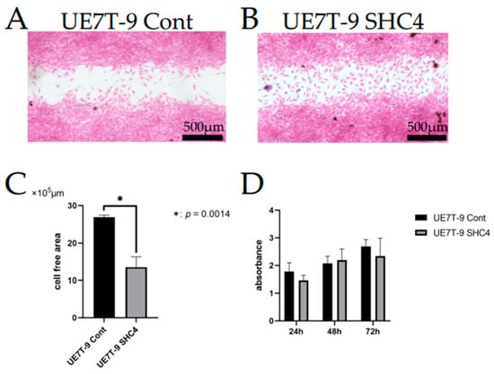 An MTS assay was performed to evaluate cell proliferation. We cultured UE7T-9 cells at 0.5 × 10⁴ cells/well in 96-well plates. At 24, 48, and 72 h of culture, we added 20 µL of MTS (2 mg/mL) (Promega, Madison, WI, USA )/PMS (0.92 mg/mL) (Promega, Madison, WI, USA) to each well. The wells were light-shielded and placed in an incubator for 2–3 h. We measured absorbance at 490 nm and 650 nm using a microplate reader ELx808 IU BioTek Instruments Inc. (Thermo Fisher Scientific, Walthum, MA, USA). Data were statistically analyzed using the Student’s t-test.