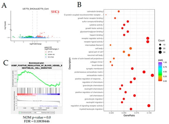 SHC4 overexpression did not promote cell proliferation but significantly enhanced cell migration in UE7T-9 cells. This was confirmed by the RNA sequence analysis, which showed an enrichment of genes involved in the pathway of cell migration in UE7T-9 SHC4 compared to the control, suggesting that