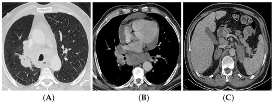 A 64-year-old male cigarette smoker with bronchogenic adenocarcinoma. Axial CT image (A) reveals spiculated right upper lung lobe mass ( cm). Axial CT image at distal level (B) reveals ipsilateral hilar, mediastinal LN with central necrosis, and pericardial effusion. Axial CT image of upper abdomen (C) reveals bilateral metastatic suprarenal masses.