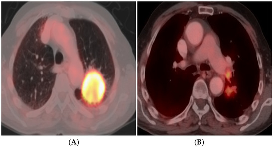 A standardized uptake value (SUV) is employed to semiquantitatively interpret the PET scans. SUV signifies the level of 18F-FDG uptake. If any lesion has an SUV higher than the background mediastinal blood pool uptake, then it is deemed hypermetabolic, and is expected to be malignant (Figure 2). Early studies of PET/CT in the literature approved as a threshold SUVmax [49,50,51].