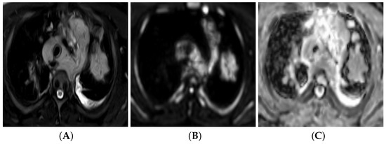 Diffusion-weighted imaging (DWI) was found to be the most beneficial modality for pulmonary nodule characterization compared to other MRI assessed sequences. Meta-analysis reported a sensitivity of and a specificity of in distinguishing benign from malignant tumors [64]. DWI is a noncontrast functional MR sequence that uses the restriction of water molecule motion to assess tissue cellularity. Malignant lung tumors reveal restricted diffusion owing to their increased cellularity and reduced extracellular space [65] (Figure 3). The apparent diffusion coefficient (ADC) map can be used to perform qualitative and quantitative DWI analysis. Malignant lung tumors have a significantly low ADC compared to benign lesions (Figure 3). Thus, DWI is considered a radiation-free alternative for characterizing pulmonary nodules [66,67].