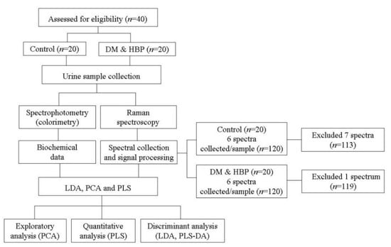 Figure 1 shows the diagram of the experimental setup, the number of eligible samples assessed, the total spectra included in and excluded from the study, and the data processing and analysis employed as detailed in the following sub-sections.