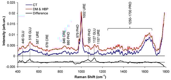 Figure 2 shows the mean Raman spectra of the CT and DM&HBP groups in the 400–1800 cm−1 spectral range as well as the difference spectrum (DM&HBP-CT). The spectra are mostly dominated by Raman peaks corresponding to urea, creatinine, glucose (particularly for the DM&HBP group), phosphate, and proteins (also for the DM&HBP group). The urea peaks were at 516 (overlap with glucose), 587, 1002, and 1157 cm−1; the creatinine peaks were at 678, 846, and 910 cm−1 (overlap with glucose); the phosphate peaks were at 880, 979, and 1080 cm−1, the glucose peaks were at 446, 516 (overlap with urea), 910 (overlap with creatinine), 1080 (overlap with phosphate), and 1127 cm−1; protein peaks were between 1250–1700 cm−1. The overlap of some Raman bands (for instance, the 516 cm−1 peak) occurs due to similarities in the energy vibrations of carbon single bonding in such organic compounds, particularly, the C–C, C–N, and C–O modes (C–C–O bending for glucose [] and N–C–N and N–C–O bending for urea []). The main difference between both groups was the presence of glucose peaks (446, 516, 1080, and 1127 cm−1). These Raman peaks have been previously described [,,,,,,,].