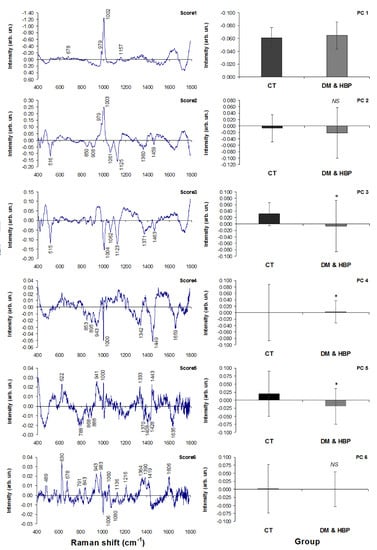 Plot of the first six principal component variables (Scores and PCs) extracted from the Raman dataset. The biochemical assignments seen in the Scores were based on the positions of the Raman bands compared to the literature. PC3, PC4, and PC5 show statistically significant differences between the groups (t-test, p < 0.05 *).