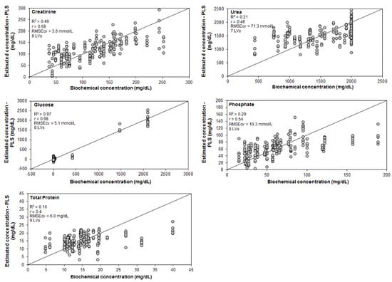 Figure 4 presents correlations between the real and estimated concentrations of the different biomarkers. The data revealed that creatinine and glucose were the biomarkers that presented the highest r between the two techniques analyzed (r = 0.68 and 0.98, respectively), both with 8 LVs, and RMSEcv = 3.6 and 5.1 mmol/L, respectively.