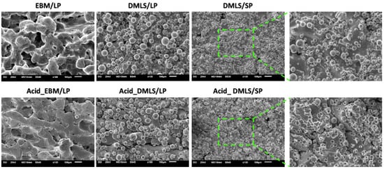 Figure 3 demonstrates the surface roughness measurement results of all 3D printed Ti discs. Before acid etching, the DMLS/SP disc had the smoothest surface compared to the two EBM/LP and DMLS/LP ones (p < 0.01). There was no significant difference between the EBM/LP and the DMLS/LP groups. After acid etching, the EBM/LP group had the roughest surface among the three acid-etched groups (p < 0.01). When comparing the surface roughness before and after the acid etching, no surface roughness changes were found in the DMLS/SP and DMLS/LP discs. However, the Acid_EBM/LP disc surface became rougher than the EBM/LP one (p < 0.01). This roughness measurement should be interpreted carefully because the roughness Ra came from both the surface roughness and the fused particle height.