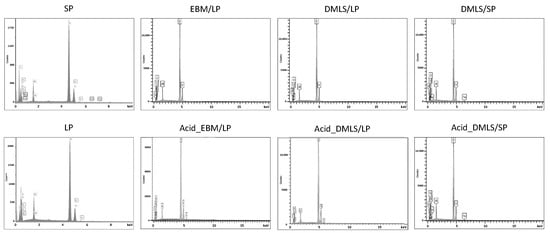 Protein adsorption to an implant surface is considered as the first event that happens when the implant is placed into the bone osteotomy. The amount, composition, and stereo configurations of the adsorbed proteins affect cell attachment, proliferation, differentiation, maturation, and osteointegration [,,]. Figure 4 shows that there was no difference in the protein adsorption to the surface of the pre-print Ti powder particles, which indicates that the powder particle size itself does not influence the composition of the adsorbed proteins. After the 3D printing process, small molecular weight proteins were adsorbed on the surfaces of the Ti discs. This result demonstrated that both DMLS and EBM may have changed the Ti surface properties, and consequently, the 3D printed Ti implants could have different proteins attached. After the acid etching treatment, no obvious changes in the protein bands were seen in the Ti discs printed with EBM before and after acid treatment. However, there were differences in the protein adsorption in the Ti discs printed with DMLS, which is parallel with the observations in the SEM images (Figure 1). Acid etching removed many small particles in the DMLS discs and left many tiny dents, but such changes were not found in the acid-treated EBM discs. This surface topography may have changed the surface microtexture, energy, and charges, thus affecting different protein adsorptions. The EDX analysis revealed that the element composition of Ti, Al, V, O, and C in the surface of the disc was not changed with the 3D printing and acid etching. The identification of the proteins and their concrete effects on the cell biological activities also need to be further explored.