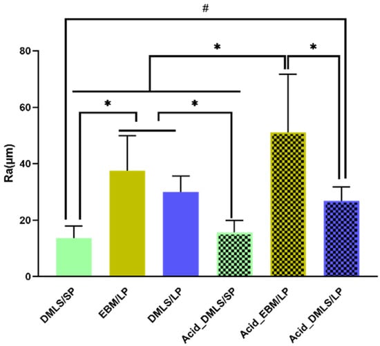 It is reported that the rough surfaces created by 3D printing had greater osseointegration because the fixation strength of the rough-textured implants provided superior interlocking relative to the smooth-textured ones []. The surface roughness measurement (Figure 3) showed that the Ti discs printed by EBM and DMLS with a large particle powder had rougher surfaces compared to those printed by DMLS with a small particle powder. Therefore, the surfaces with large particles (average 100 µm) or no particles, such as those of the EBM discs, may be better for osseointegration than the surfaces with small particles.
