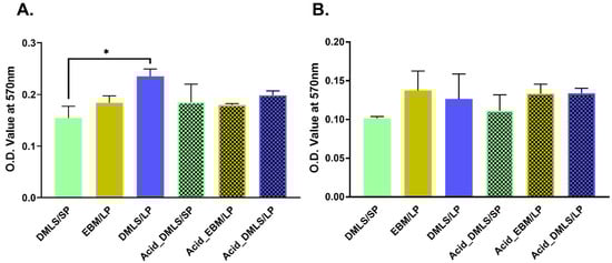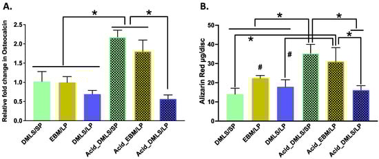 Osteocalcin (OCN) is a marker to indicate functional osteoblast formation []. The OCN gene expression in each group is shown in Figure 8A. The post-treatment using acid etching resulted in increased OCN gene expressions in the Acid_DMLS/SP and Acid_EBM/LP discs compared to the other printed discs. Paralleled with the OCN gene expression, they also had more calcium deposition (alizarin red contents) when compared to all untreated discs as well as the Acid_DMLS/SP discs (Figure 8B), signaling that these two groups had more calcium in the mineralization than the other groups.
