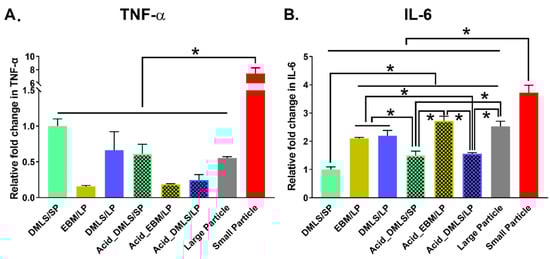 TNF-α and IL-6 genes expression of MC3T3-E1 cells cultured on 6 types of 3D printed Ti discs with small and large particles for 24 h was quantified by real-time qPCR using 2−ΔΔCt method. (A) TNF-α gene expression. The small particles showed an increased (more than 7 times) in TNF-α gene expression compared to the 3D printed discs as well as the large particles. There was no statistically significant difference among the remaining groups. (B) IL-6 gene expression. The small particles showed the highest IL-6 gene expression compared to the 3D printed discs as well as the large particles. The DMLS/SP group had the lowest IL-6 gene expression. Before acid etching, IL-6 gene expressions were higher in the discs printed using EBM/LP and DMLS/LP than DMLS/SP, while there was no difference between EBM/LP and DMLS/LP. After acid etching, IL-6 gene expression was increased in the Acid_DMLS/SP group and decreased in the Acid_DMLS/LP group. The Acid_EBM/LP group had about a 2-fold increase in IL-6 gene expression compared to the Acid_DMLS/SP and Acid_DMLS/LP. There was non-significant difference in EBM discs before and after acid etching. DMLS: direct metal laser sintering. EBM: electron beam melting. LP: large particle, SP: small particle. * indicates p < 0.01; performed in triplicate.