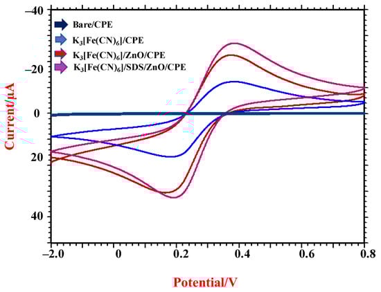 To calculate the active area of the developed sensor, 1.0 mM K3(Fe (CN)6) was used as a probe and 0.1 M KCl as a supporting buffer. The CV measurements were taken for various scan rates displayed in Figure 1. Randle Sevcik Equation (1) was employed in calculating the area of the electrode [34] with the help of the value of slope obtained from Ip vs. √ υ plot. We calculated the electrode’s area, which was found to be 0.058 cm2, 0.094 cm2, and 0.099 cm2 for bare CPE, ZnO/CPE, and ZnO/SDS/CPE, respectively.