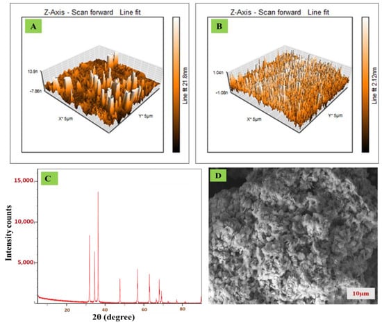Characterization of ZnO nanoparticles (A) AFM of CPE; (B) AFM of ZnO/CPE; (C) XRD of ZnO; (D) SEM morphology of ZnO.