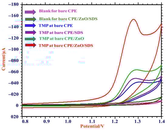 Electrochemical investigations of TMP were performed by employing the CV technique using 0.5 mM of TMP (in pH 3.0) at scan rate 0.05 V/s. Figure 3 shows the presence of an oxidation peak for all four electrodes (CPE, SDS/CPE, ZnO/CPE, ZnO/SDS-CPE). However, the double-fold-enhanced peak intensity was observed for ZnO/SDS-CPE at 153.9 µA, with a peak potential value of 1.280 V. In the presence of SDS, a good interaction occurred between the negatively charged monomers of SDS and they were strongly attracted towards the positively charged amine moiety on TMP (Scheme S1). On the reverse scan, the reduction peak was not detected and it indicates the process to be irreversible.