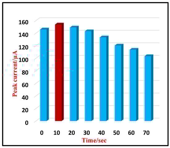 The time required for an analyte molecule to accumulate at the electrode surface can influence the electrode’s sensitivity. Hence, to study the effect of accumulation time, CV measurements were recorded for different time intervals from 0 to 70 s using 0.5 mM TMP at 0.05 V/s scan rate. The change in peak intensity was observed with respect to time and higher peak intensity was obtained at 10 s (Figure 4) and, hence, 10 s was preferred as an immersion time for further investigations.