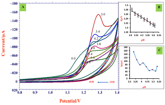 An electrochemical examination associates the control of peak potential by utilizing different supporting electrolytes. This was executed to enhance the conductivity of the solution. We initially examined the electrochemical behavior of TMP at ZnO/SDS/CPE in different electrolytic solutions, such as citrate buffer, Briton-Robinson buffer, sulphuric acid, and PBS at pH 3.0 (Figure S2). A well-defined oxidation peak was observed in the PBS-supporting electrolyte. Impact of PBS was studied for 0.5 mM TMP at ZnO/SDS/CPE for different pH ranges (from 3.0 to 6.0) using the CV technique at 0.8–1.4 V potential window. Voltammograms are displayed in Figure 5A. A well-resolved single oxidation peak was detected for all pH ranges and it can be noticed that with the rise in pH of supporting buffer concentration, a shift in peak potential (Ep) occurred, which is towards the less positive side, revealing the presence of H+ in the oxidation of TMP [35]. After investigating the pH range above 6.0, we noticed the absence of a peak current, which concludes that the oxidation of TMP at ZnO/SDS/CPE can be acidic. The graphs for Ep and pH are plotted in Figure 5B, which gave a fitted equation Ep = −0.0219 pH + 1.340, R2 = 0.988 and the slope value obtained was −0.0219 V/pH, which is nearest to the standard value of −0.021 V, which specifies that the electron and proton engaging in the reaction mechanism are uneven in number [36]. From Figure 5C, we can observe that at pH 3.0, the peak current (Ip) was intense; hence, the supporting electrolytic solution of pH 3.0 was chosen for further measurements. Further, we examined the impact of pH using the DPV technique and obtained results similar to the above CV results (Figure S3).