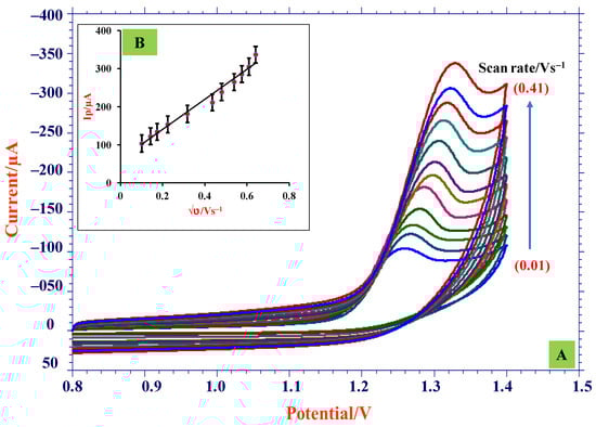 Resultant slope (−0.384) was significantly closer to the predicted value 0.5; therefore, we can conclude that the reaction was governed by the process of diffusion [38]. From plot, Ip vs. √ν (Figure 6B) gave the linearity equation below.