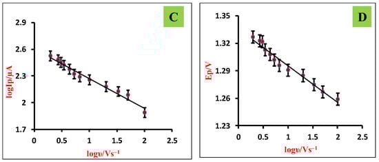 The scan rate studies give insights into reaction mechanisms and the dependence of peak current and peak potential on scan rate. Therefore, the impact of scan rate on electro-oxidation of TMP was studied by employing CV technique at ZnO/SDS/CPE using 0.5 mM TMP by altering the scan rate from 0.01 to 0.41 V/s with its optimum pH at 3.0 (Figure 6A). The voltammograms showed that with a peak current increase, peak potential slightly shifted towards the positive direction and peak current increased gradually, indicating the irreversible nature of reaction [37]. The increase in peak intensity with increasing scan frequency is due to the signal being anticipated due to improved charge transfer during system capacitance loading. In addition, a linear equation for the log of Ip vs. log ν (Figure 6C) acquired is shown below.