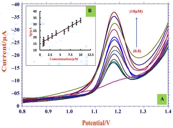 (A) DPVs of concentration variation (0.8 µM–10 µM) at ZnO/SDS/CPE; (B) graph of Ip and concentration.