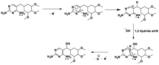 In the electrochemical reaction of TMP, pH investigation confirmed the presence of protons, whereas per variation of scan rate studies, two electrons were transferred in the electrochemical oxidation reaction. Further, in this mechanism, electron losses occur initially from a non-bonding electron from nitrogen (non-bonding electrons are higher in energy). The electron-deficient nitrogen pulls the electron from the pyrimidine ring. As a result, positive charge was created and an unstable ion is formed. Hence, a rapid 1,2 hydride shift takes place, leading to the formation of secondary carbocation, which is attacked by the hydroxide ion. From the collected data, the plausible electrochemical mechanism can be predicted, as described in Scheme 1.