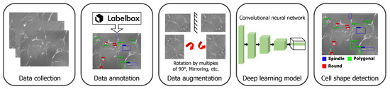 To detect the cell shapes, we extended the use of a state-of-the-art deep neural network developed for object detection tasks [23]. In this work, we were interested in detecting the following shapes: (i) round, (ii) spindle, and (iii) polygonal. We differentiated the spindle shape from the polygonal shape if the shape had two narrow ends. With this DL-based approach, we detected and localized cells with particular shapes. In Figure 1, we summarize the pipeline for the cell shape detection, which includes data collection and annotation, then data augmentation, training of the deep neural network, and finally outputting the detected cell shapes and their location in the image.