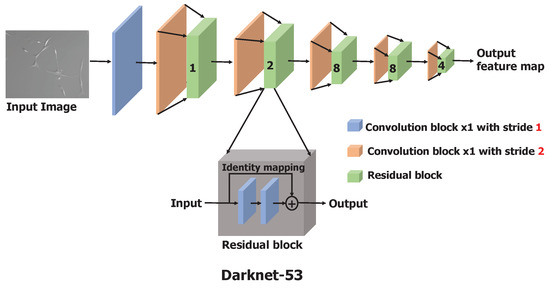 Darknet-53 is a significantly larger and enhanced version of Darknet-19, a feature extractor proposed as a backbone model in YOLO(v2) [26], by adapting the residual network [27] concept. Darknet-53 has 53 convolutional layers as opposed to having 19 layers as in Darknet-19. This backbone model is constructed by stacking multiple convolutional and residual blocks, as illustrated in Figure 2. Each convolutional block is a sequence of a convolutional layer with a filter size of 3 × 3 and stride of 2, batch normalization, and a leaky-ReLU. To downscale the input image or input feature map, a convolution layer with a stride of 2 is used to minimize the information loss relative to the use of pooling operations such as max-pool [27,28]. Batch normalization is used to speed up the convergence during training and to regularize the model [29]. Each residual block is a stack of two convolutional blocks with a filter size of 1 × 1 and 3 × 3 , respectively, with the stride of 1. At the end of the residual block, an identity connection is implemented by adding the input of the residual block to the second convolutional block with the shortcut connection [27]. The input image is processed and downscaled by a factor of 32 through these stacks of convolutional and residual blocks to obtain the feature maps as the output of Darknet-53.