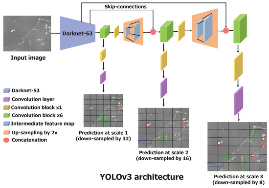 The predictions at the first scale are obtained by processing the output of the base feature extractor, Darknet-53, by adding a few convolutional layers, where the output has the shape downscaled by a factor of 32. The feature map obtained by the layer, which precedes two layers, is upsampled by 2 and concatenated with the feature map of the same resolution from Darknet-53. This maintains the low-level features from Darknet-53 and allows one to learn meaningful semantic details. Similar to the first scale prediction, the second scale prediction is obtained by feeding the upsampled feature map to several convolutional layers. The third scale prediction involves the same operations—upsampling and concatenating the feature map from Darknet-53—and passing through convolutional layers. This process is described in Figure 3. The bounding box coordinates and confidence scores were processed through the sigmoid function to obtain values in the range of 0 and 1. We were interested in multiclass classification as the cell cannot simultaneously have more than one shape, and we used the sigmoid function to output the probabilities for each cell shape. The one cell shape with the highest probability was considered the predicted cell shape. Actual coordinates of the predicted bounding box in an image were calculated using Equation (1). To select the most significant and accurate bounding box among the thousands of bounding box predictions, YOLOv3 uses a nonmax suppression technique. It removes the duplicate boxes predicted based on the confidence score and the IoU score between the predicted and the actual bounding box.