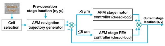 The closed-loop navigation module aimed to move the AFM stage from its current location (i.e., preoperation location) to the target cell smoothly and precisely such that the probe was right above (along the vertical direction) the selected cell for AFM characterization measurements. The working process of the AFM closed-loop stage navigation process is shown in Figure 4. In our work, the conversion factor between the optical image pixels and the distance (in metric unit), i.e., the AFM coordinate system, was calibrated by using a silicon calibration sample that had 5 by 5 μm square pitches on its surface. Pixel numbers of the pitches were counted in multiple optical images of the silicon sample to calculate the pixel size in metric unit, thus obtaining the pixel-to-distance conversion factor. As the network was also trained to recognize the AFM probe, the probe location in the optical image was used as the reference point for stage navigation. With the cell shape identification and selection performed, the desired AFM stage navigation trajectory (i.e., the stage position vs. time profile) was generated using the distance (x and y distances on the horizontal plane) between the current location of the AFM probe and the preoperation location of the selected cell to be measured.