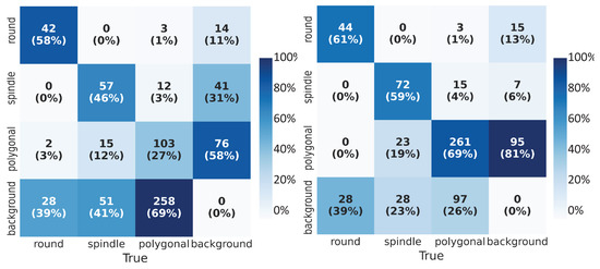 The performance of the object detection network was evaluated on the test data set using various metrics. Combining with numerical metrics, we displayed the accuracy of the cell shape detection by visualizing the predictions obtained using YOLOv3. We used the confusion matrix (CM) to assess the classification performance. The CM specified the number and percentage of correctly (true positives, true negatives) and incorrectly (false positives, false negatives) classified class labels for bounding boxes. Values along the columns (’True’ classes) were normalized. We compared the confusion matrices (CMs) (Figure 5) for both of the experiments and observed that the network trained on low-quality images alone could only detect on average 44% of the labeled boxes correctly; on the other hand, with transfer learning, we observed on average 63% of correct classification of cell shapes (diagonals of the matrices). With the transfer learning approach, we could reduce the false negatives (bottom rows of matrices) from almost 50% to 29%. This meant that the network failure rate to detect the cell samples was lower with transfer learning. From the last columns of the CMs, we deduce that the trained network could detect the unlabeled boxes which contain the cell shape but were not annotated explicitly. Furthermore, we observed fewer misclassifications of the cell shapes (i.e., correct detection of cell but incorrect classification of its shape) after transfer learning.