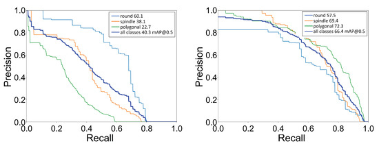 Figure 6. Precision-recall (PR) curve: Plot of PR curve for each cell shape with IoU threshold of 0.5. (Left) PR curve for the network trained on only low-quality images, mAP@0.5 = 40.3, (Right) PR curve for the network trained using the transfer learning technique, mAP@0.5 = 66.4.