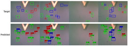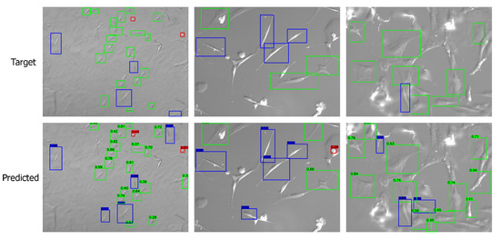 Apart from the numerical metrics, we evaluated the performance of the transfer learning approach by visualizing the predicted bounding boxes and corresponding class labels and comparing them with the labeled images. We performed inference and visualized both low- and high-quality images in Figure 7 and Figure 8, respectively. The visuals are arranged so that the ground truths/targets are shown in the top row, and the predictions are in the bottom row. Visualizing the predictions demonstrates the cell shape detection performance as it can detect most labeled shapes. Additionally, it can detect many cell shapes that were not labeled in the ground truth, as we understood from the last column of the confusion matrix. We notice that the predicted (but unlabeled) shapes are almost all correctly classified.