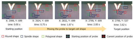 Figure 9. We show the sequence of images demonstrating the AFM probe navigation from starting to target position based on the cell shape identification result. We specify the (x, y) co-ordinates of the AFM probe at current location and the cumulative time to travel just below each image. Processing time was approximately 3.62 s at a navigation speed of 100 μm/s.