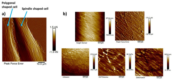 Figure 10a shows the AFM peak force error image of a polygonal cell (on the left) and a spindle-shaped cell (on the right). This peak force error image shows an enhanced contrast across live cells revealing structural and topographical details of the actin cytoskeleton filament network running across the NIH-3T3 cells compared to the height sensor image that gives an idea about the height of the cell. The peak force error image represents an arbitrary measure of the regulation error of the AFM feedback loop. The actin cytoskeleton network is the major force-generating structure inside the cell that is also responsible for resisting any force applied to the cells externally by ECM or neighboring cells. Figure 10b depicts five high-resolution maps of nanomechanical properties. Observing these high-resolution maps makes it evident that on top of long actin filaments, Young’s modulus is much higher (around three times), and deformation values are much lower than in other regions of the cell body. Although adhesion should be generally added to Equation (2), measuring adhesion forces in this particular study would not make much sense as the functionalization of the AFM cantilever tip was not performed to probe any specific interactions between the substrate and the AFM cantilever tip.
