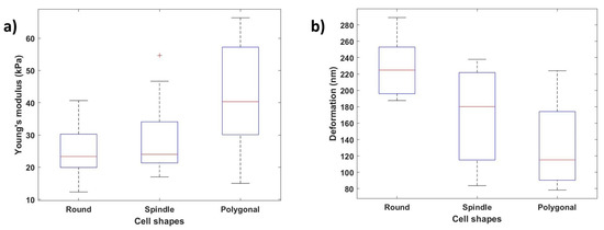 Figure 12a,b show how the Young’s modulus and deformation values vary depending on the cellular shape. We can conclude that the nanomechanical properties change along with the cell shape variation depending on these results. Young’s modulus values were calculated at ten different locations along the cell body, and the average of these values was considered. Polygonal cells with the stronger and larger actin cytoskeletal networks demonstrated the highest Young’s modulus values (average: 41.71 ± 15.68 kPa), the round cells demonstrated the lowest Young’s modulus values (average: 24.80 ± 7.78 kPa), and the spindle-shaped cells demonstrated mid-level Young’s modulus values (average: 27.92 ± 10.24 kPa). Similarly, the polygonal-shaped cells showed the lowest deformation (average: 228.19 ± 34.01 nm), and the round-shaped cells (average: 132.23 ± 47.66 nm) showed the highest deformation values.